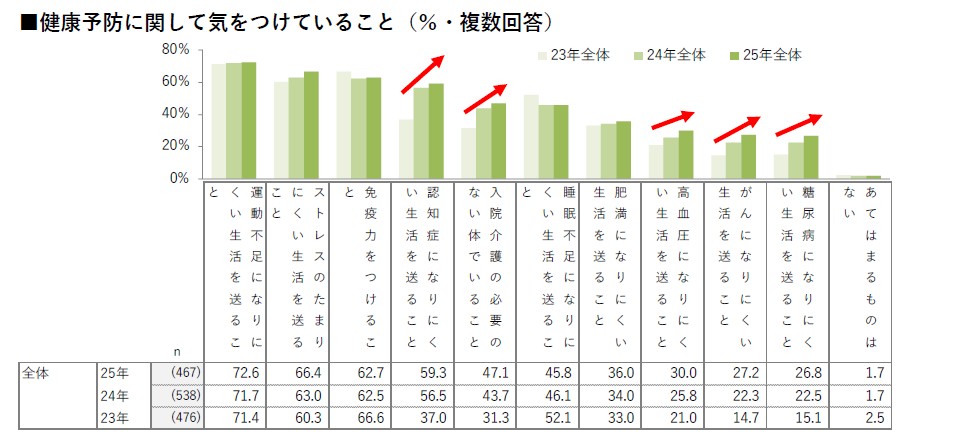 【健康に関する意識・実態調査2025】”認知症予防“ や ”病気になりにくい生活” など健康予防への意識が向上傾向。健康にかける費用も約15.7万円と、昨対比約1.8万円アップ。