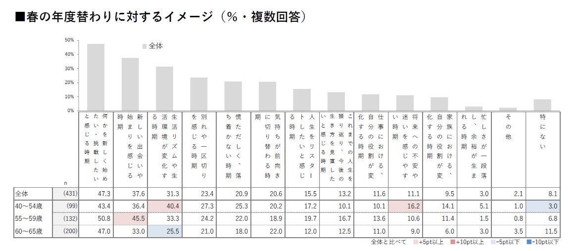 【HALMEK up×生きかた上手研究所 共同調査】ミドルエイジ女性の「春の節目」に関する意識・実態調査春は"再スタート"の季節!55~59歳の約半数が「何かを新しく始めたい」と回答