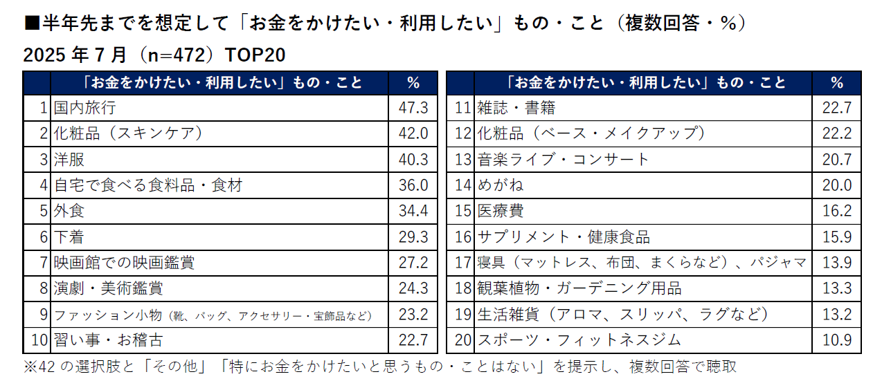 【買い物に関する意識・実態調査】約2人に1人が「国内旅行」にお金をかけたいと回答。また、化粧品・洋服・映画など、日常の“ご褒美消費”も増加傾向。