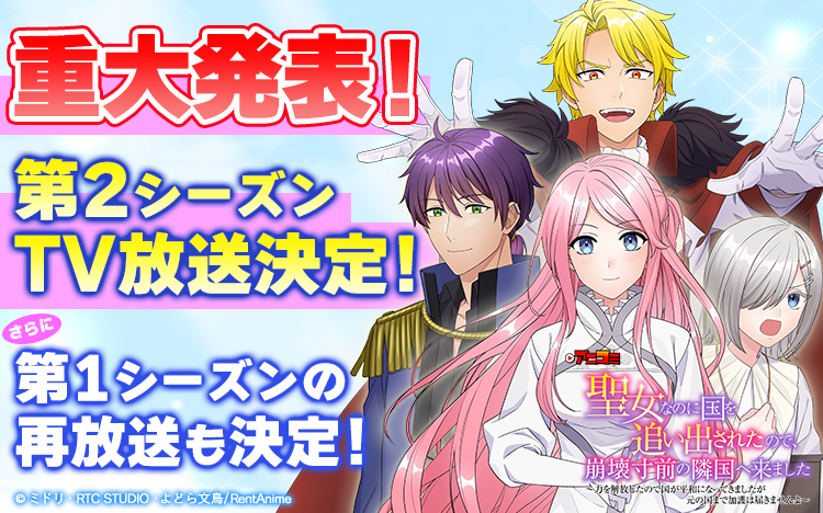 【Renta!】『【アニコミ】聖女なのに国を追い出されたので、崩壊寸前の隣国へ来ました シーズン2』が2026年1月より放送決定!2025年10月にはシーズン1の再放送も!