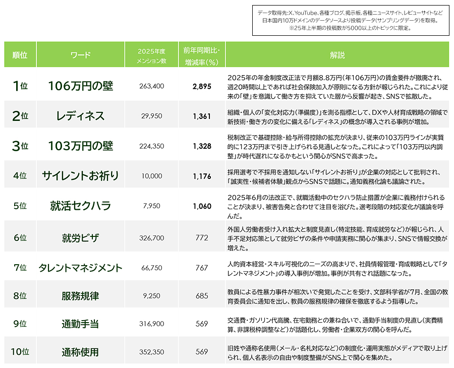 「はたらくソーシャル・リスニング(25年度上半期)」を発表 「年収の壁」への関心が続く - 制度改正への“戸惑い”と”期待“が交錯
