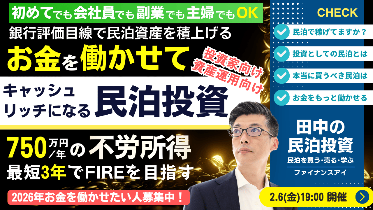 1/4民泊セミナー開催。会社員でも3年でFIREを目指せる!2026年の新民泊開業。銀行評価目線で民泊資産に投資するキャッシュリッチ民泊投資。半自動で稼げる仕組みとは