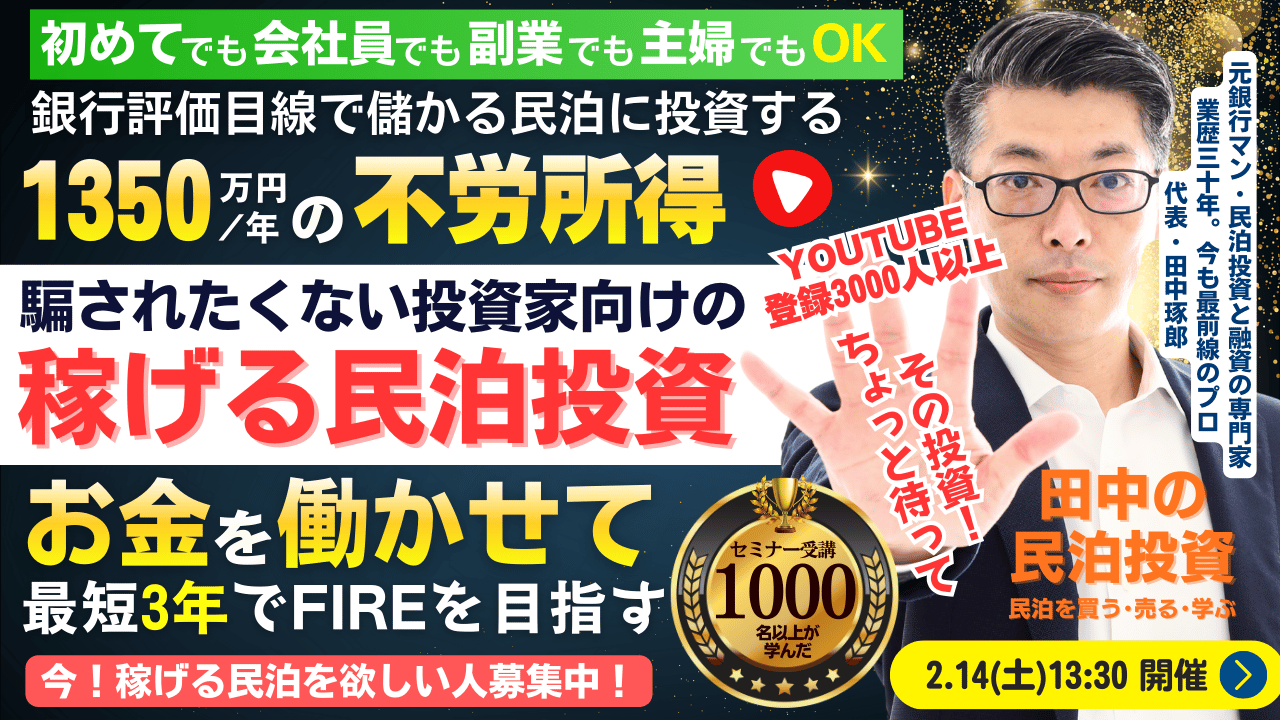2/28(土)民泊セミナー。最短3年でFIRE!年間1,350万円を目指せる。最初の一棟目から資産形成を支援。民泊投資家を多数輩出中の『稼げる民泊YouTube』登録者3000人以上の元銀行マンが支援