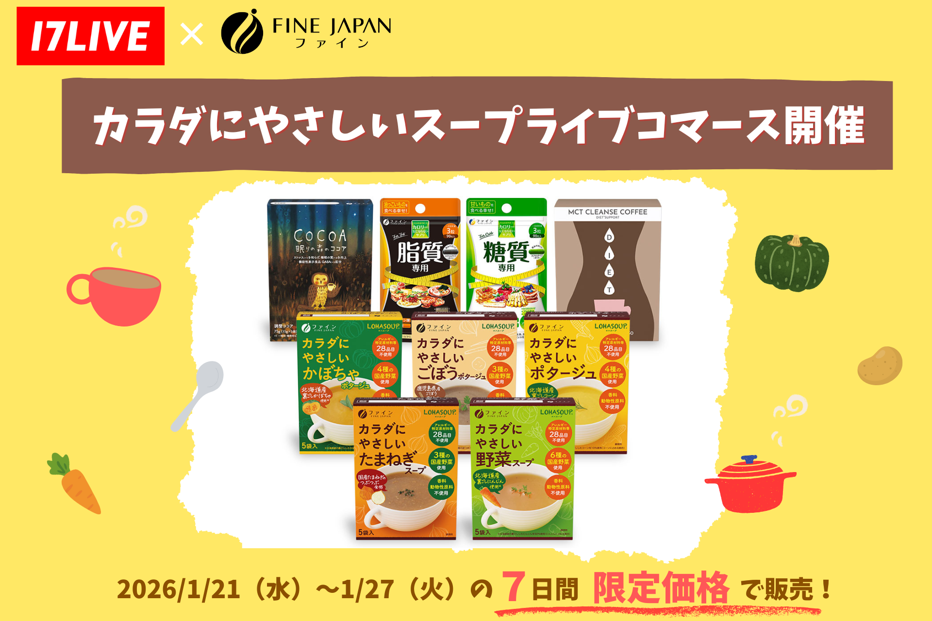 【17LIVE × 株式会社ファイン】人気イチナナライバー40名が健康習慣をライブでお届け!「カラダにやさしいスープ」等のライブコマースイベントを1月21日より開催
