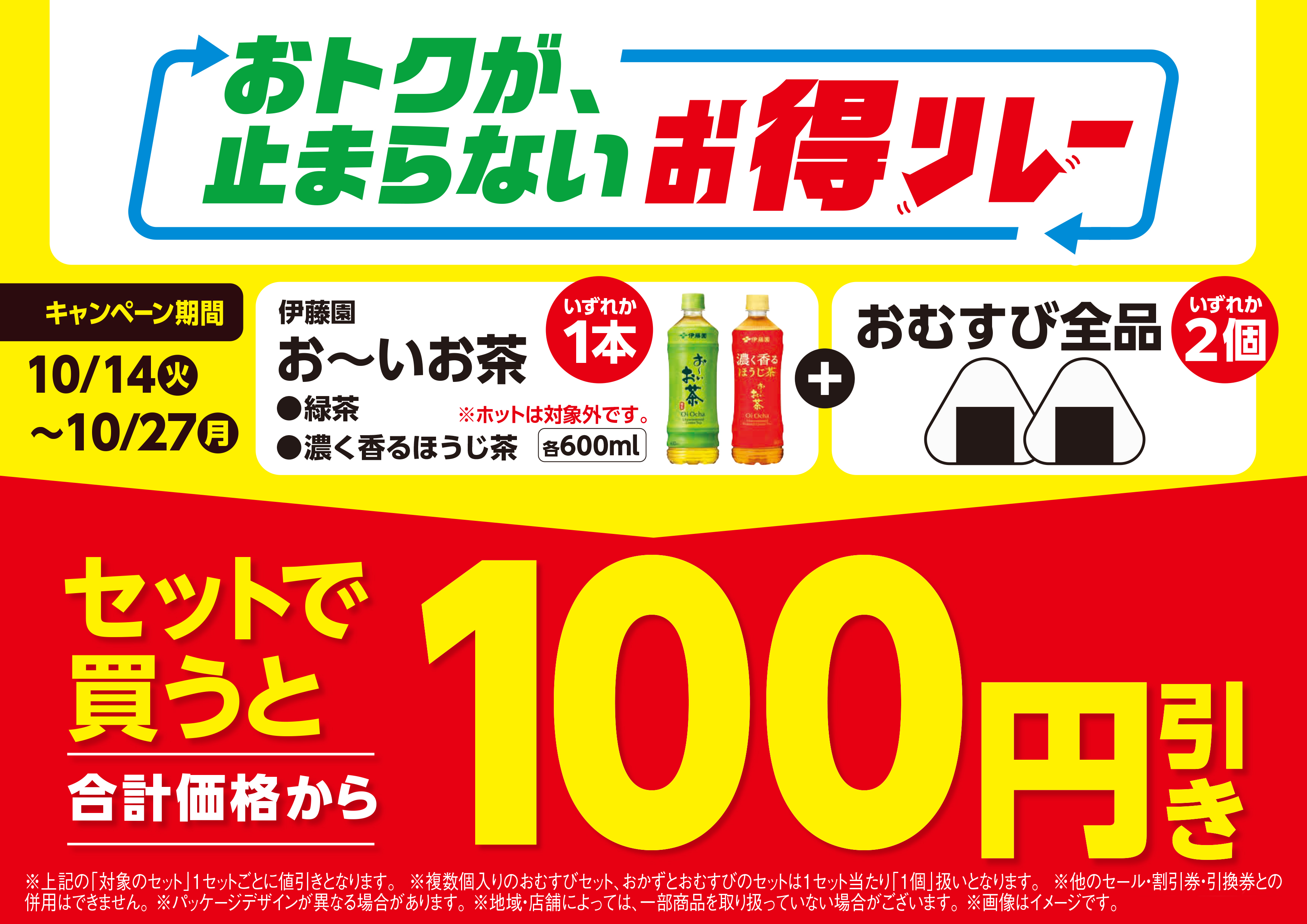 ファミマが仕掛ける“続く生活応援”キャンペーンまだまだおトクが、止まらない!「ファミマのお得リレー」第7弾はおむすび2個とお~いお茶がセットで100円引き!~秋の行楽にはやっぱりお茶とおむすび!~