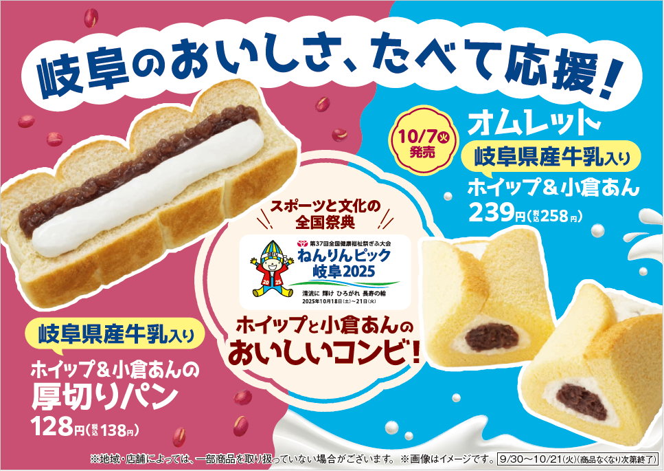 【東海地方限定】「ねんりんピック岐阜2025」応援商品 ホイップと小倉あんのおいしいコンビ!岐阜県産牛乳入りホイップ&小倉あんを使用したパンとスイーツが9月30日(火)から順次発売