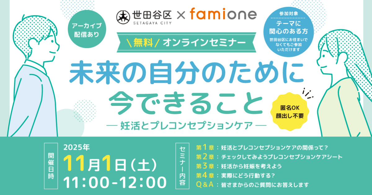 「世田谷区妊活オンライン相談事業」の一環として、妊活とプレコンセプションケアに関する無料講演会を、11月1日にオンラインにて開催します