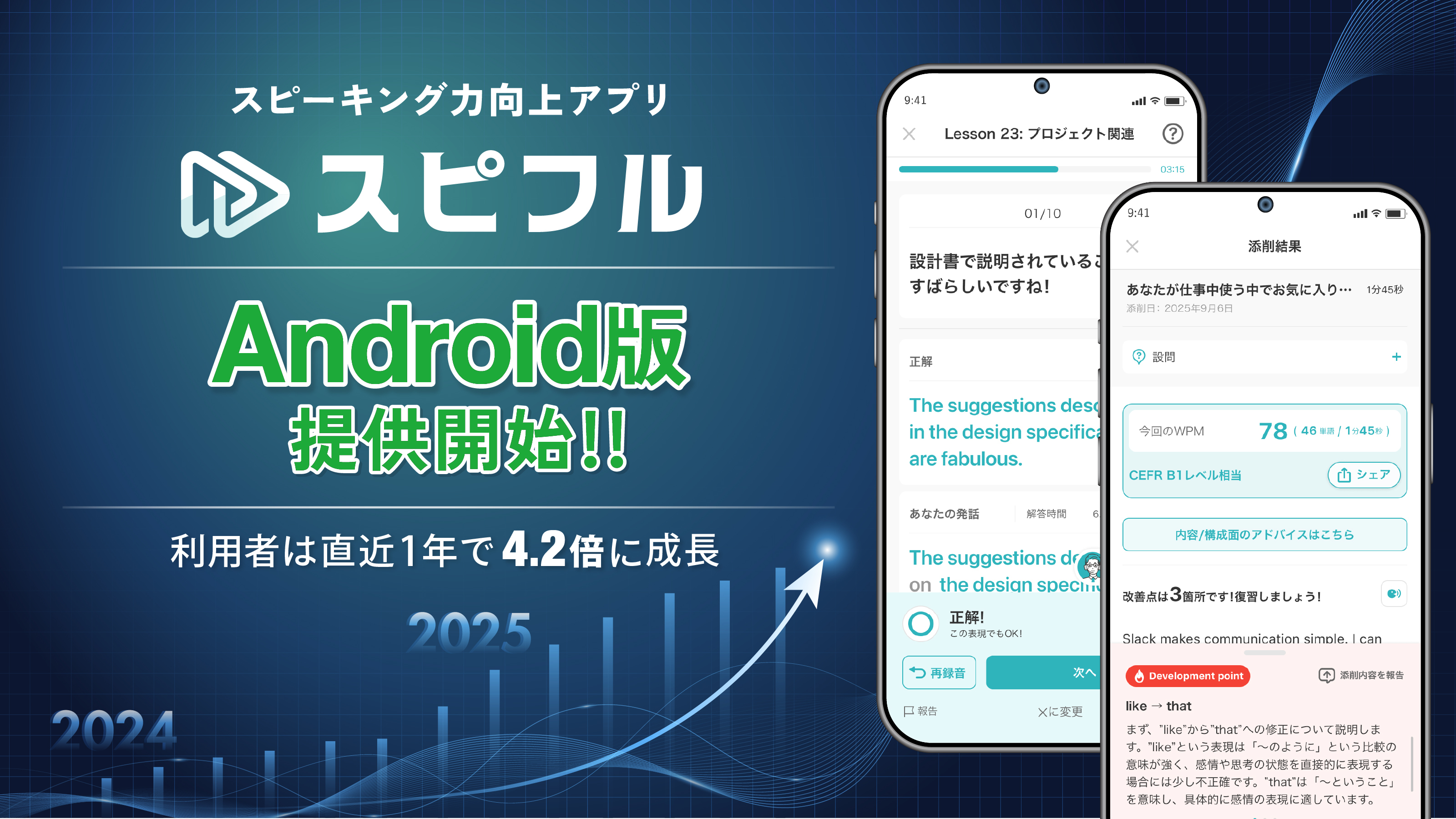スピーキング力向上アプリ「スピフル」、Android版提供開始