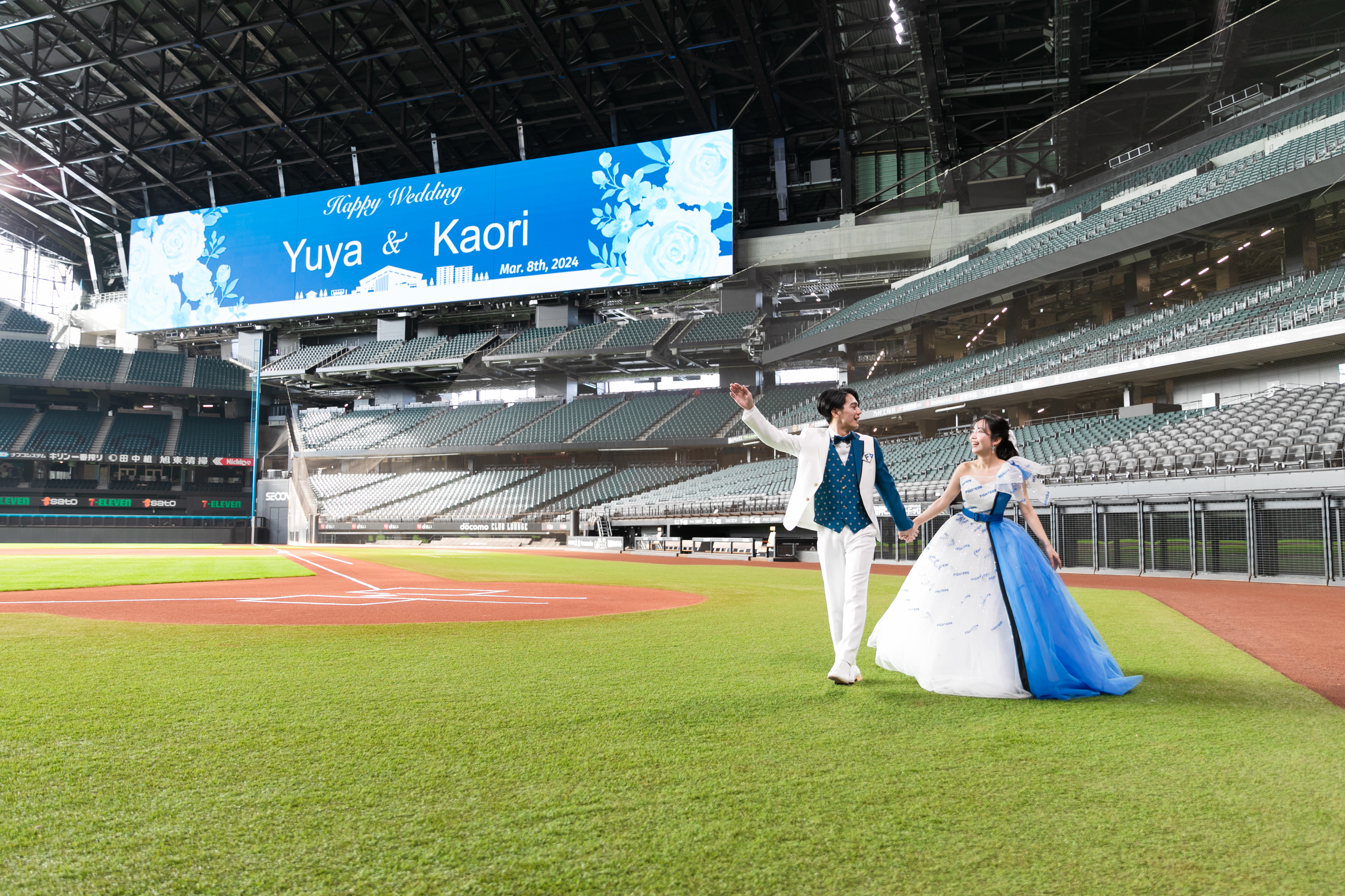 北海道日本ハムファイターズカラーのウェディングドレス&タキシード、北海道限定でベルクラシックグループに登場