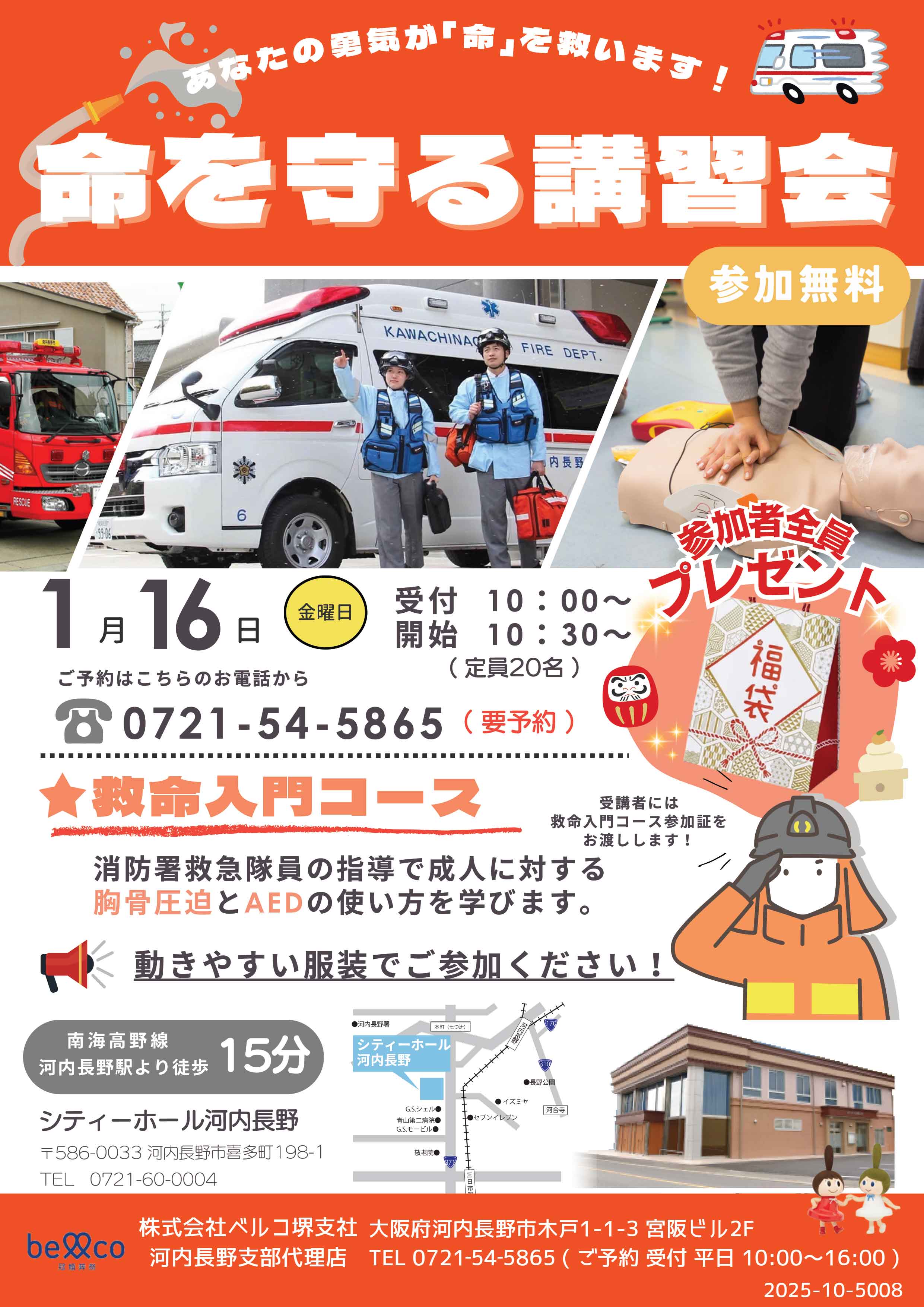 【参加無料】株式会社ベルコ堺支社・河内長野支部代理店『命を守る講習会(救命入門コース)』を1月16日に開催]