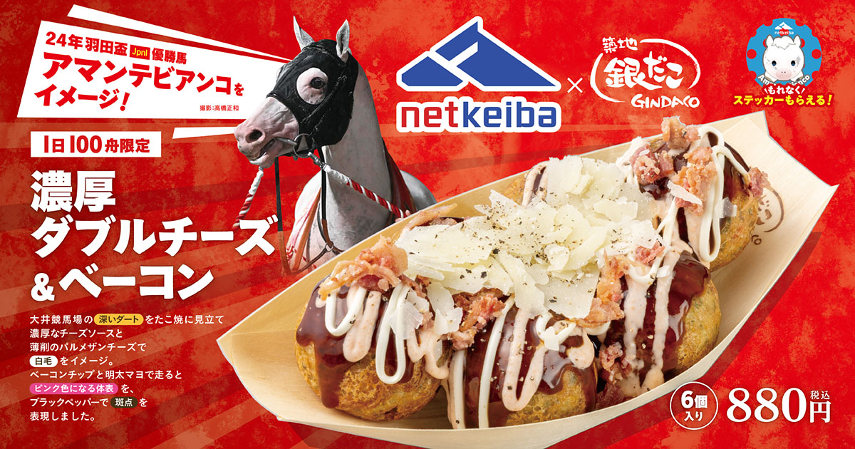 【 競馬場で “たこ焼” を楽しもう! 】築地銀だこ × netkeiba コラボたこ焼 『濃厚ダブルチーズ&ベーコン』 12/1(月)より、「大井競馬場店」 にて限定販売決定!