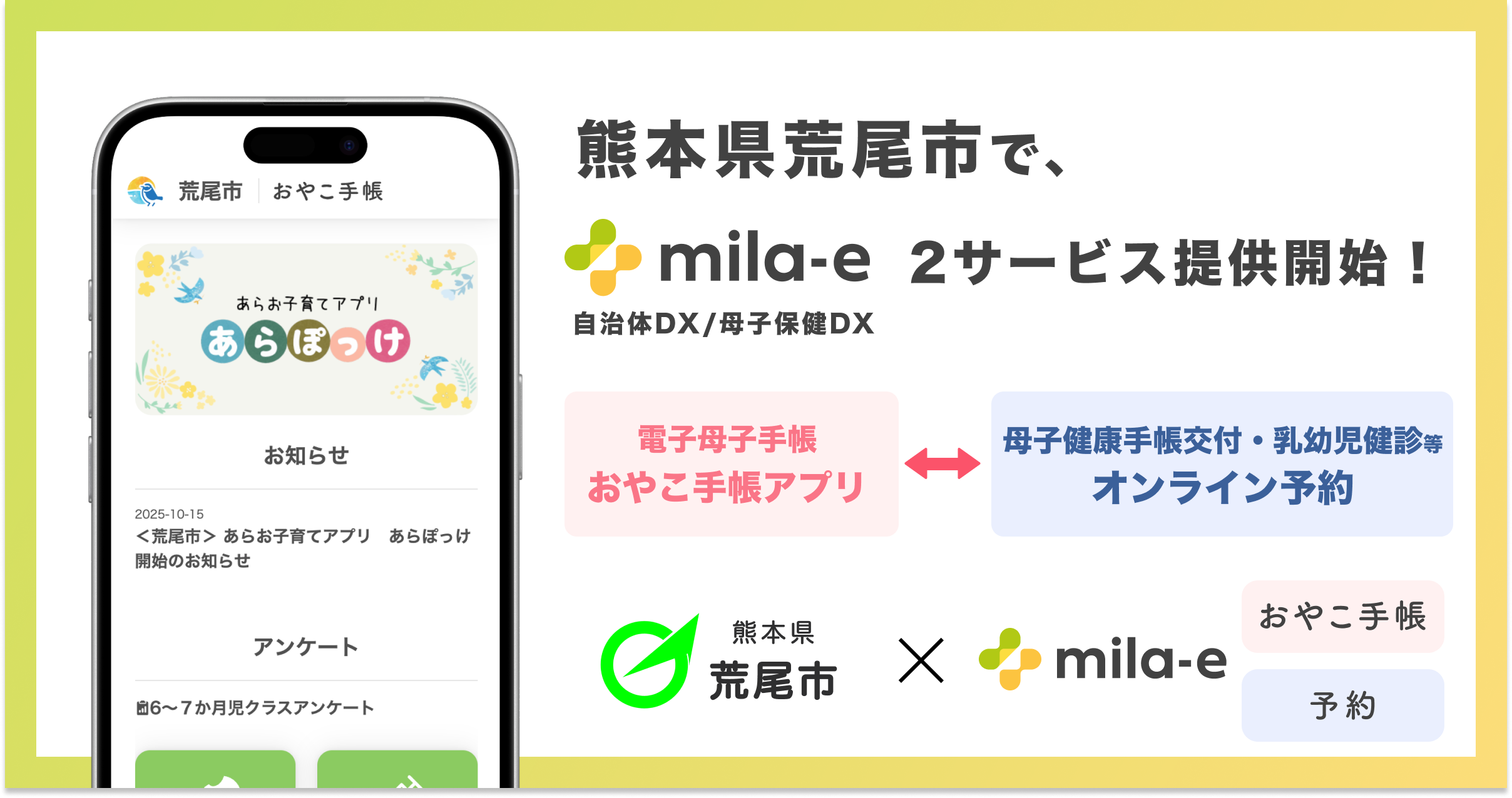 ミラボ、熊本県 荒尾市で 母子保健DX「mila-e」母子手帳アプリ・オンライン予約の提供を開始