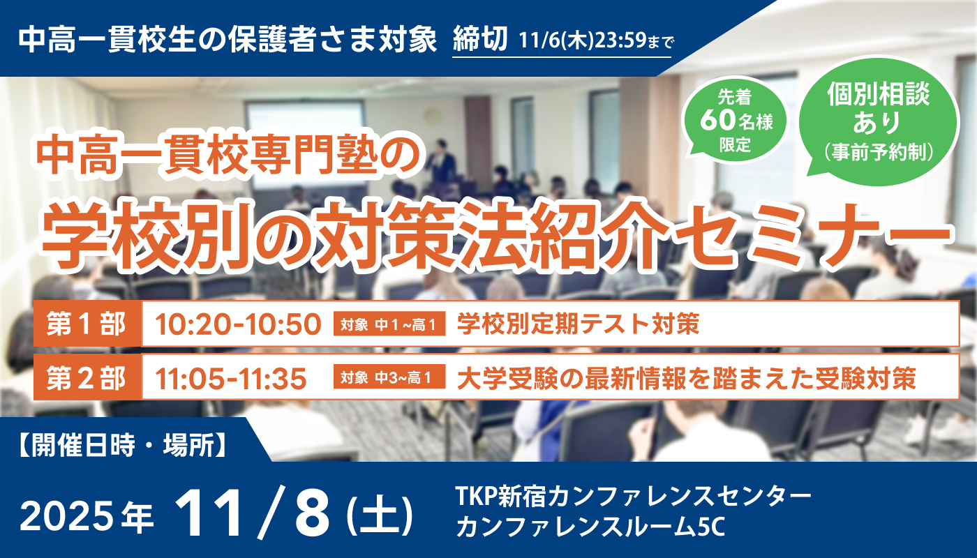 【累計参加者100名超!】中高一貫校生に向けた「学校別の対策法紹介セミナー」を11月8日(土)に新宿で開催。「定期テスト対策」と「受験戦略」を徹底解説!