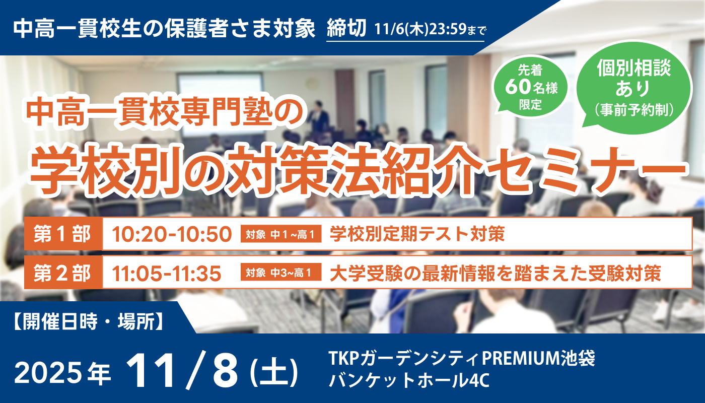 【累計参加者100名超!】中高一貫校生に向けた「学校別の対策法紹介セミナー」を11月8日(土)に池袋で開催。「定期テスト対策」と「受験戦略」を徹底解説!