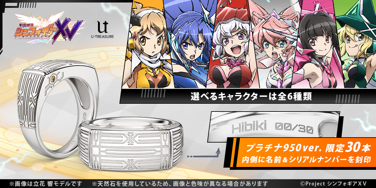 TVアニメ「戦姫絶唱シンフォギアXV」変身バンクをモチーフにしたリング(指輪)。ギアカラーをイメージした天然石を留め、内側に名前の刻印を。10月9日(木)まで予約受付