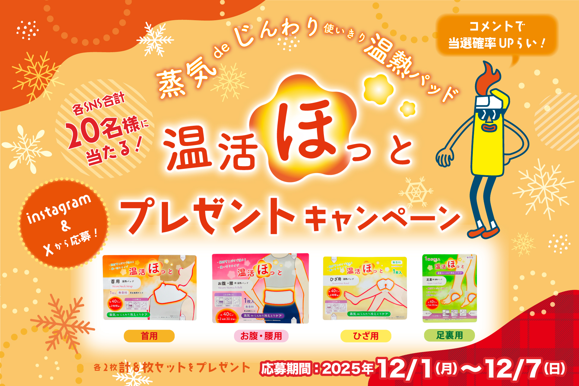 発売1周年記念!使いきり温熱パッド「温活ほっと」プレゼントキャンペーン開催。冷えないカラダづくりに役立つ4種×2セットを合計10名様に