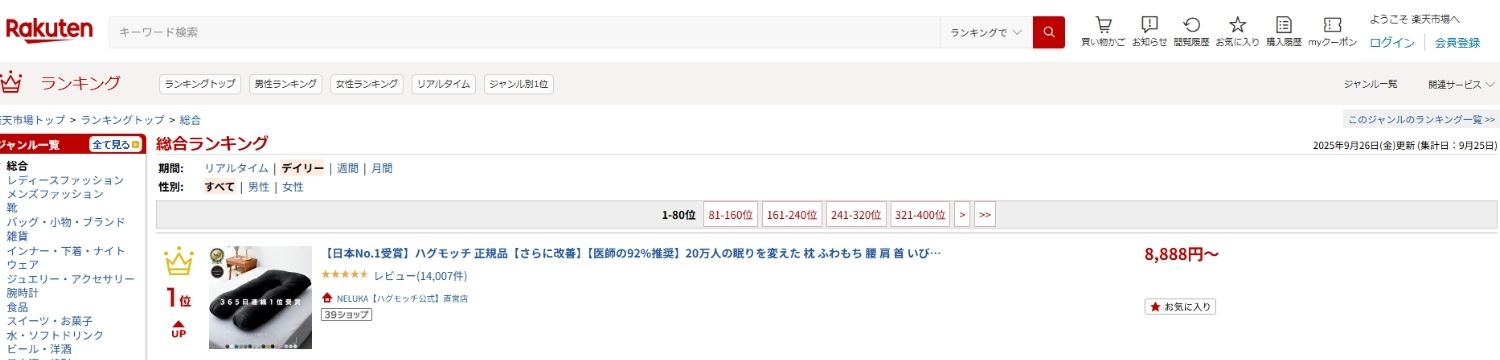 予約が続いた話題の枕「ハグモッチ」が、楽天総合ランキング1位を獲得。(※デイリーランキング 2025年9月25日分)