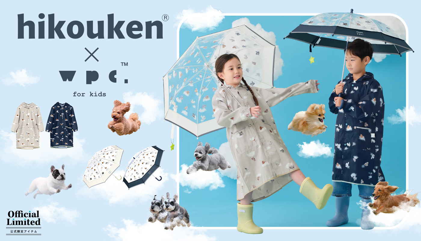 空を飛ぶワンちゃんがチャーミング!飛行犬(R)×Wpc.キッズビニール傘&レインコートが登場!お子様でも使いやすい設計と安全性に配慮したアイテムで、雨の日にワクワクを