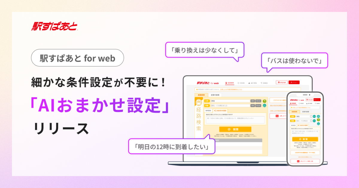 【駅すぱあと for web】細かな条件設定が不要に!AIが文章から移動の要望をくみ取る「AIおまかせ設定」の提供開始