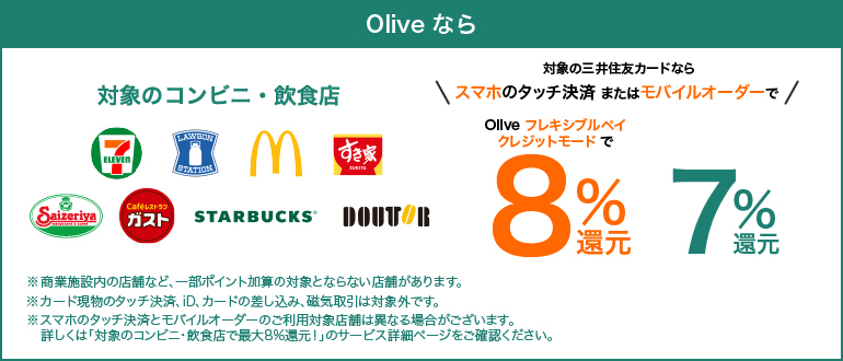 三井住友銀行「Olive」、対象のコンビニ・飲食店にて最大8%還元に