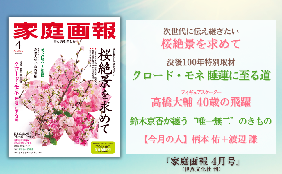 『家庭画報 4月号』2月28日発売 桜絶景を求めて/没後100年 クロード・モネ/高橋大輔 40歳の飛躍/鈴木京香が纏う唯一無二のきものほか