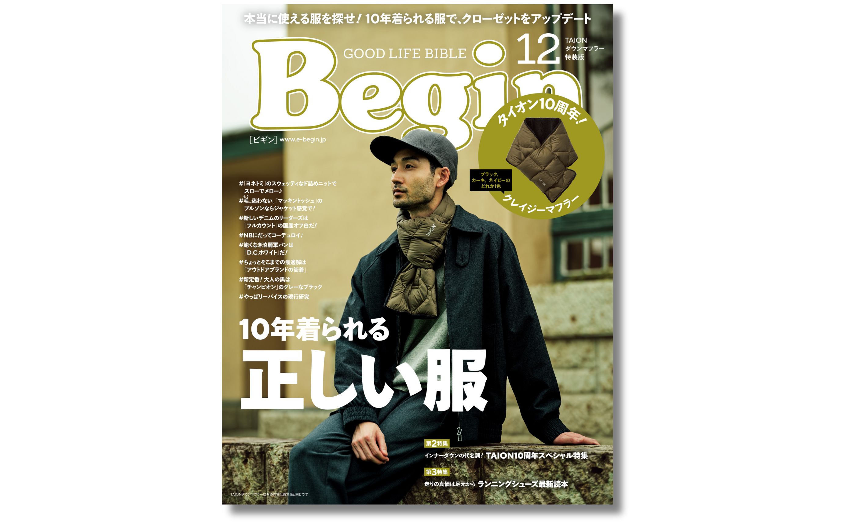 【紀伊國屋書店限定】『Begin 12月号 特装版』10月20日発売! 人気ブランド「 TAION (タイオン) 」の特製ダウンマフラーとセット