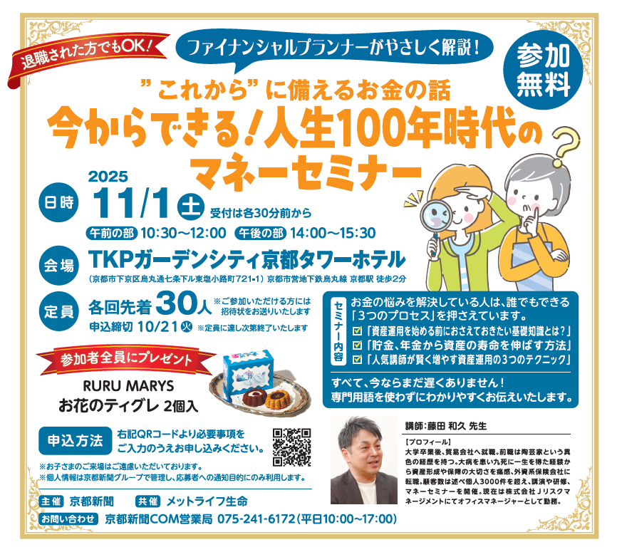【京都新聞主催】退職した方でもOK!今からできる!人生100年時代のマネーセミナー11月1日開催