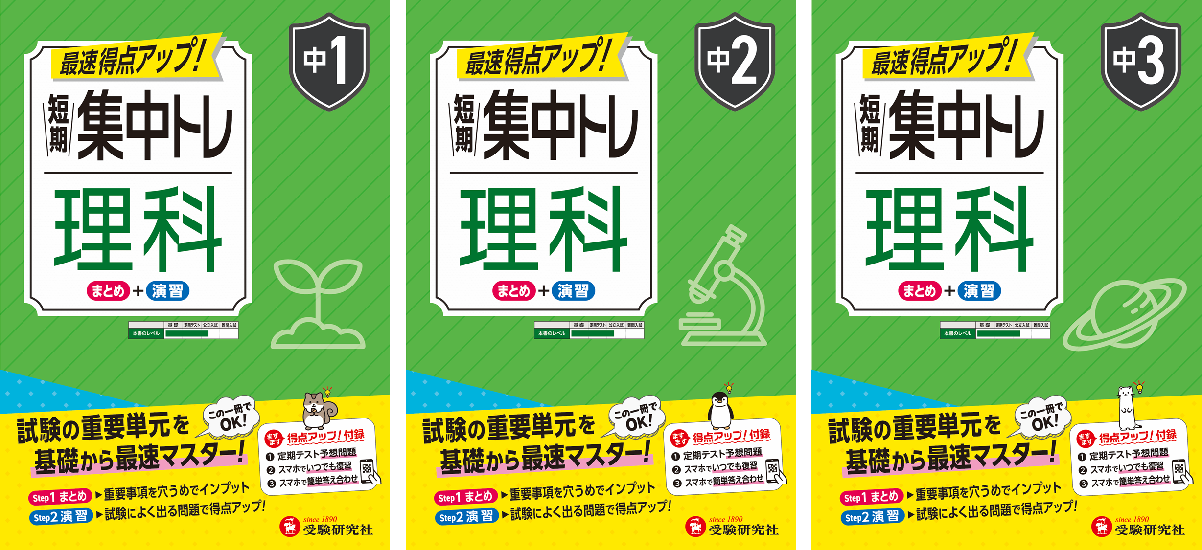 次の期末テストの理科はこれで平均点をクリア!どんな問題が解けるようになればいいのか、得点アップの道筋を見開き2ページで示す『中学 短期集中トレ』(理科 中1/中2/中3)が新登場!