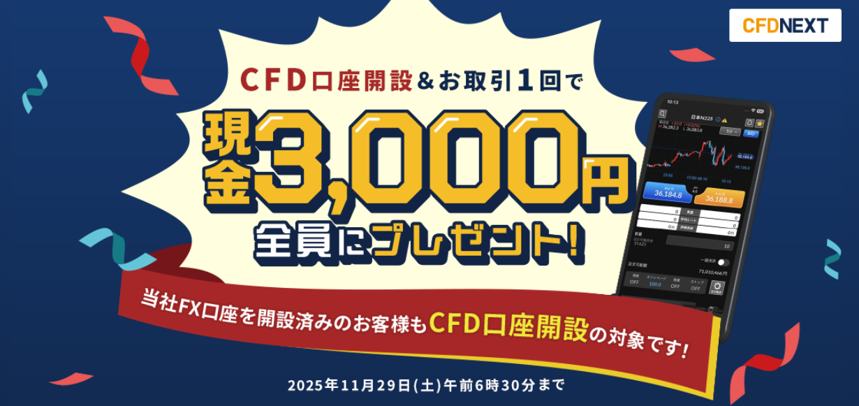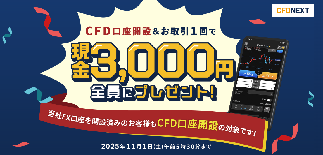 「CFD口座開設&お取引1回でもれなく3,000円プレゼント!キャンペーン」実施!