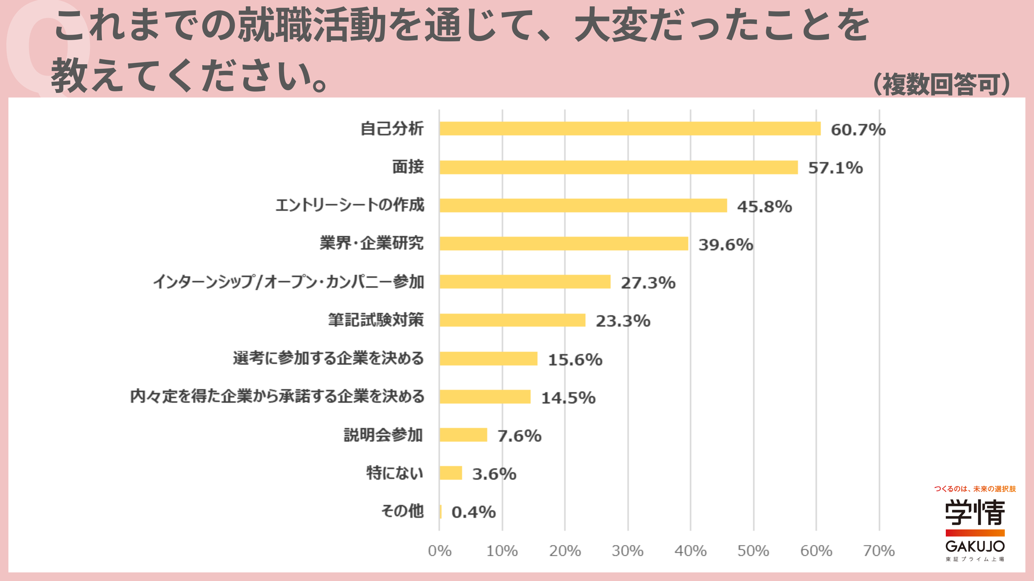 就職活動で大変だったこと、頑張って良かったことは「自己分析」が最多。もっとやれば良かったことは「業界・企業研究」がトップ