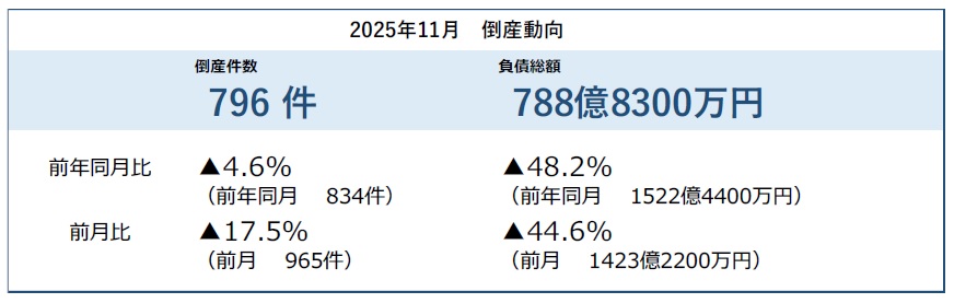 2025年11月の倒産件数796件、目立つ小規模倒産 12年ぶりの年間1万件超に ― 全国企業倒産集計2025年11月報