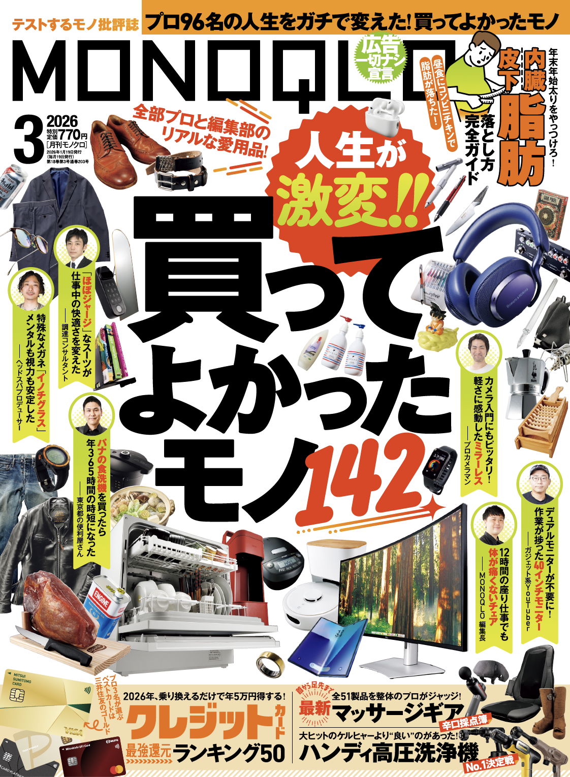人生激変!プロと編集部の「買ってよかったモノ」を大公開! 脂肪の落とし方や最新マッサージギアなど身体ケアのヒントも掲載!!【MONOQLO3月号】
