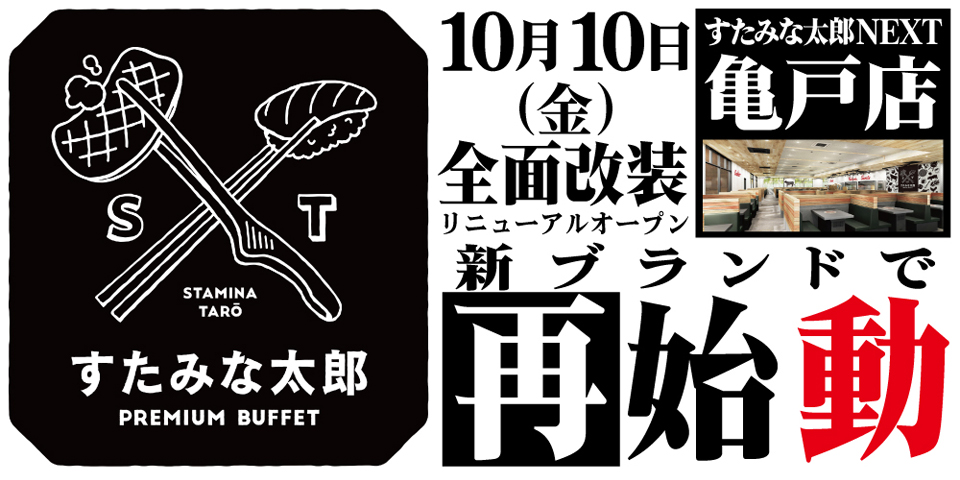 焼肉、寿司食べ放題の「すたみな太郎NEXT 亀戸店」が10/10(金)全面改装オープン!「すたみな太郎PREMIUM BUFFET 亀戸店」として再始動!限定メニューも!