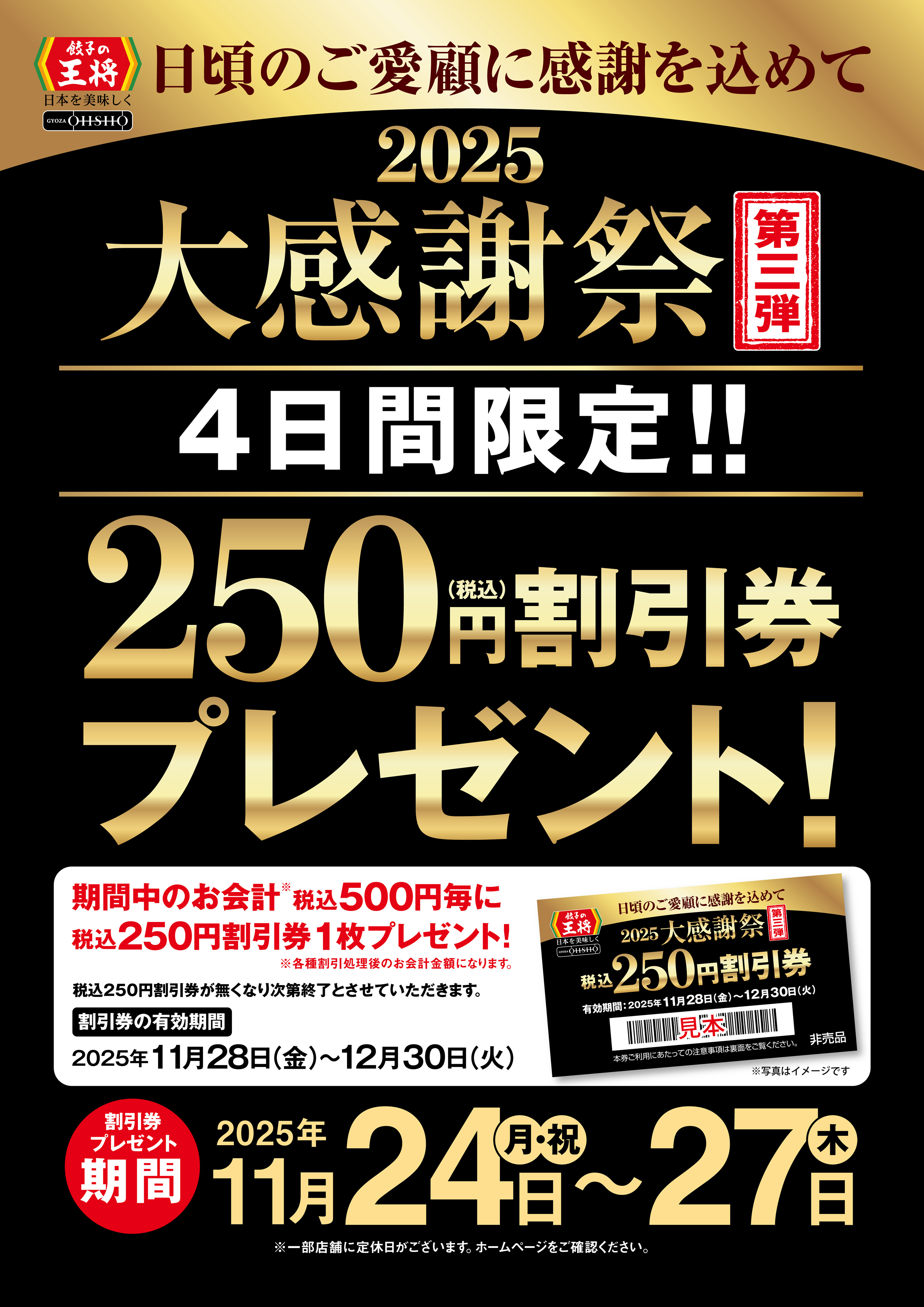 【餃子の王将】4日間限定の特別企画!「大感謝祭」第三弾開催!!