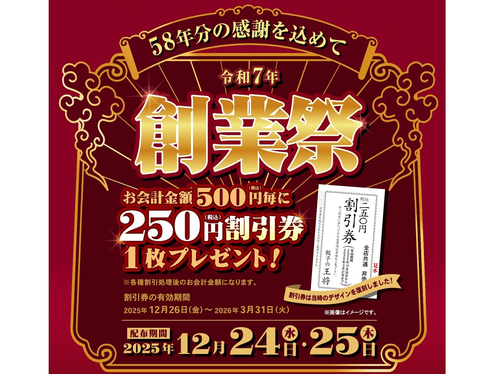 【餃子の王将】クリスマス&年末年始もお得に美味しく!「創業祭」&「年末年始お客様感謝キャンペーン」!!