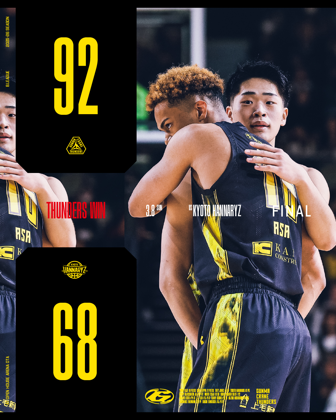 【群馬クレインサンダーズ:試合結果】3/8(日) vs 京都ハンナリーズ りそなグループ B.LEAGUE 2025-26シーズン