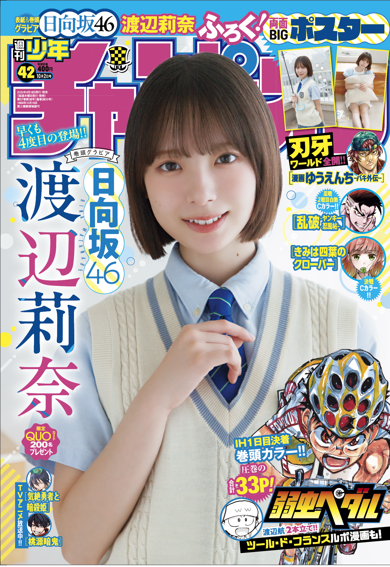 9月18日(木)発売「週刊少年チャンピオン」42号の表紙&巻頭グラビアは、日向坂46の渡辺莉奈ちゃん(ハート) 両面BIGポスターが付録としてつくほか、限定QUOカード200名プレゼント企画も!