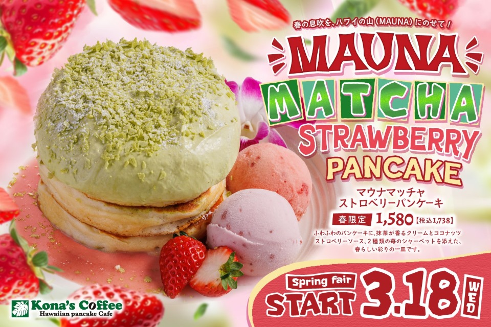 濃厚な抹茶の風味と苺の甘酸っぱさが織りなす、春らしい彩りの一皿が新登場!春限定「マウナマッチャストロベリーパンケーキ」2026年3月18日(水)より全国のコナズ珈琲にて期間限定で販売