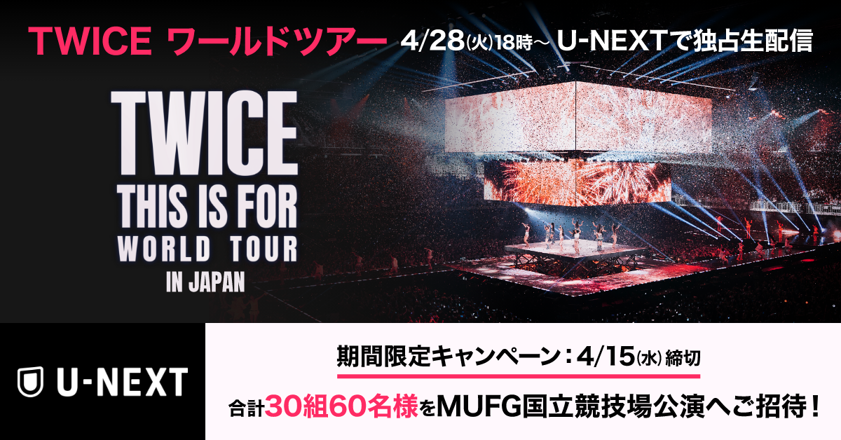 TWICE ワールドツアー「THIS IS FOR」のU-NEXT独占生ライブ配信を記念して、MUFG国立競技場公演のチケットプレゼントキャンペーン開催!過去ライブ4作品も独占配信スタート!