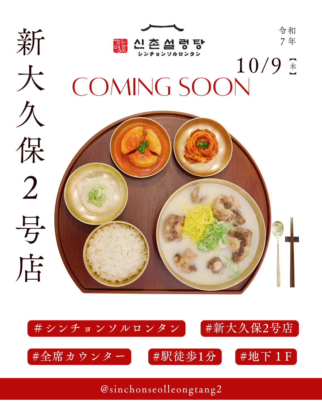 韓国で“体を整えるスープ”として親しまれるソルロンタンを提供する専門店「シンチョン ソルロンタン」が新大久保駅 徒歩1分へ 2号店をオープンします