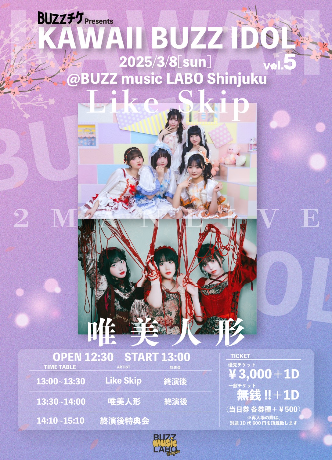 【好評シリーズ第5弾】「KAWAII BUZZ IDOL vol.5」3月8日(日)新宿で開催!唯美人形×Like Skip出演、前売0円の無銭LIVEが昼開催で登場