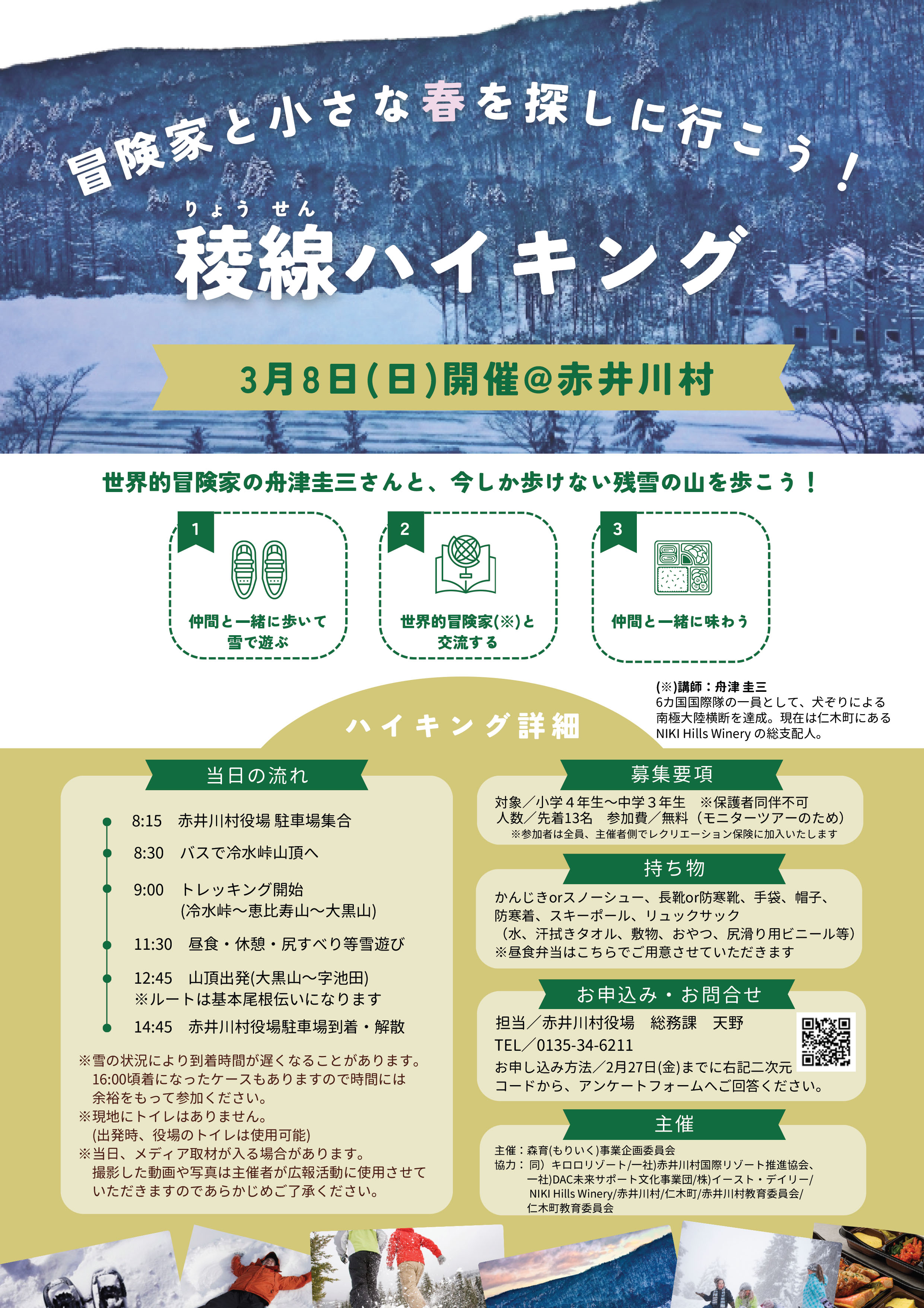 北海道 赤井川村と仁木町の子どもたちが郷土愛と挑戦心を育む。世界的冒険家・舟津圭三氏と歩く!地元の「雪の稜線」に挑む子ども向け稜線ハイキング 3/8開催