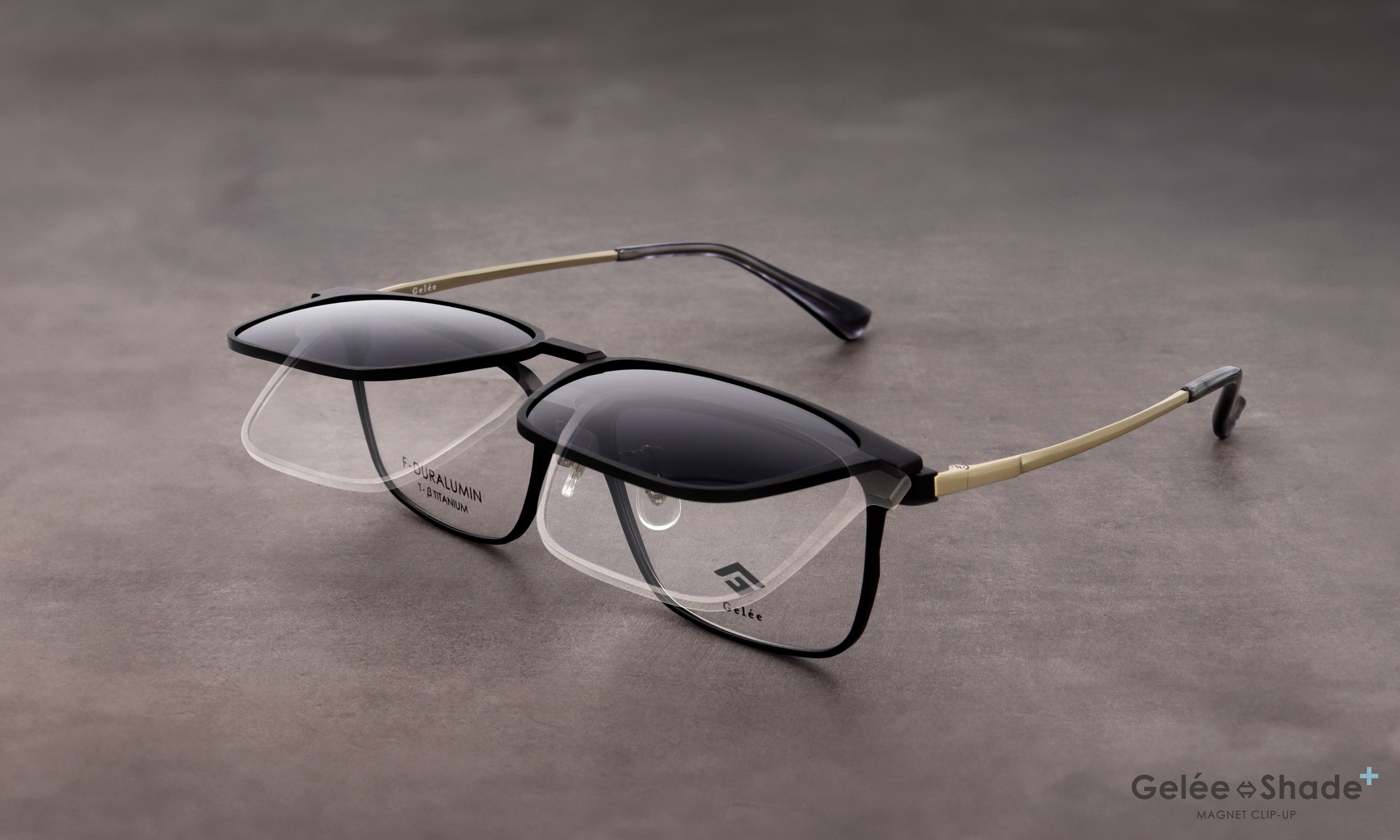 【Gelee新型 Gelee Shade +」度付きメガネが瞬時にサングラスに!脱着式クリップオンに「跳ね上げ機能」を追加。特許申請中の独自機構で利便性が大幅向上。