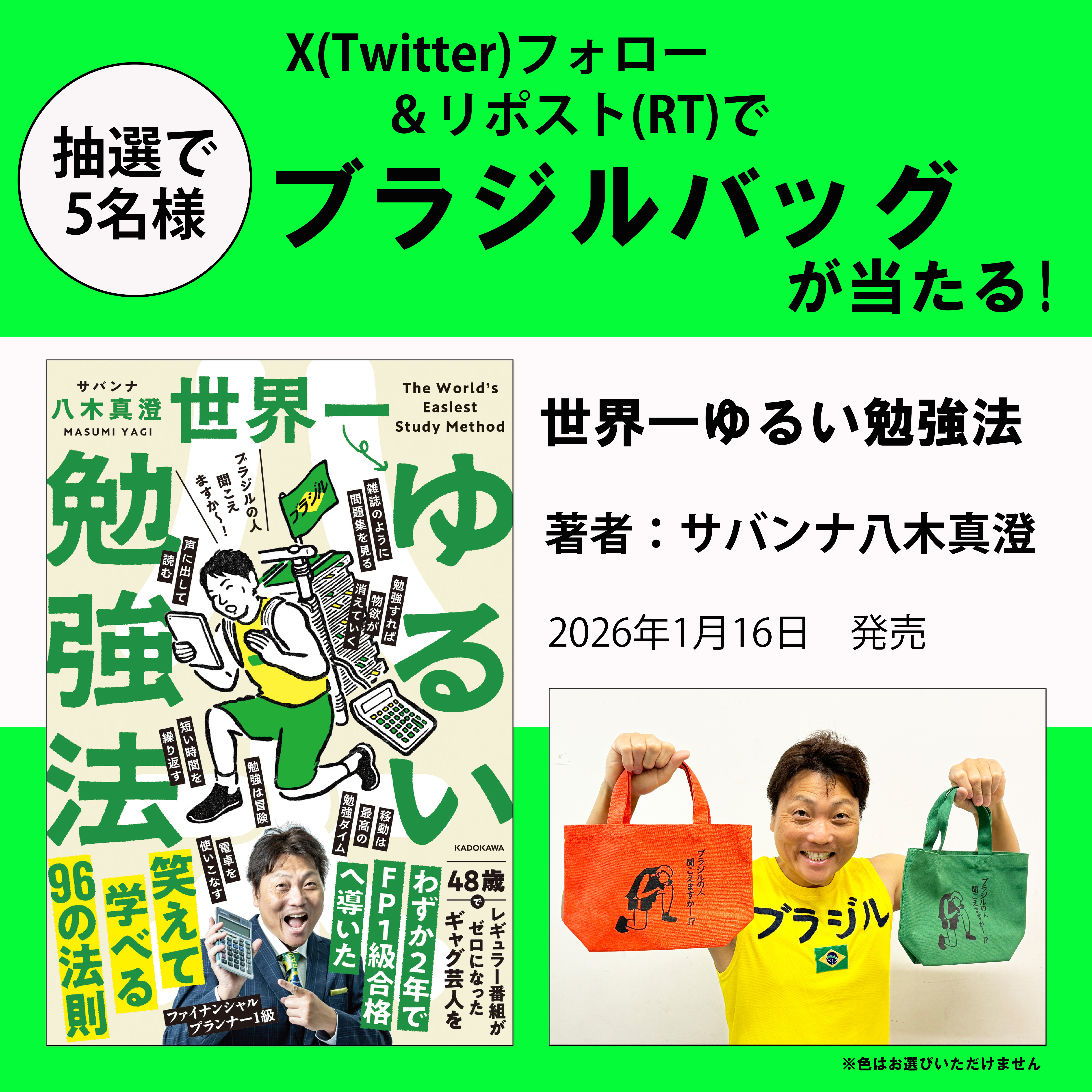 【Xプレゼントキャンペーン!!】これでFP1級に受かった!サバンナ八木が編み出した最強の勉強法を綴った最新刊『世界一ゆるい勉強法』1月16日(金)発売。抽選で5名様にブラジルバッグが当たる!!