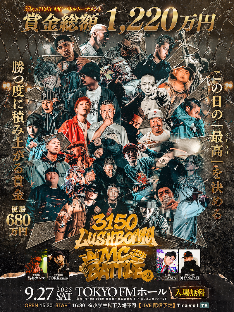 賞金総額1,220万円『3150×LUSHBOMU MC BATTLE vol.2』国内TOPレベルの賞金を懸けて競い合うフリースタイルラップバトル!第2回開催決定!!