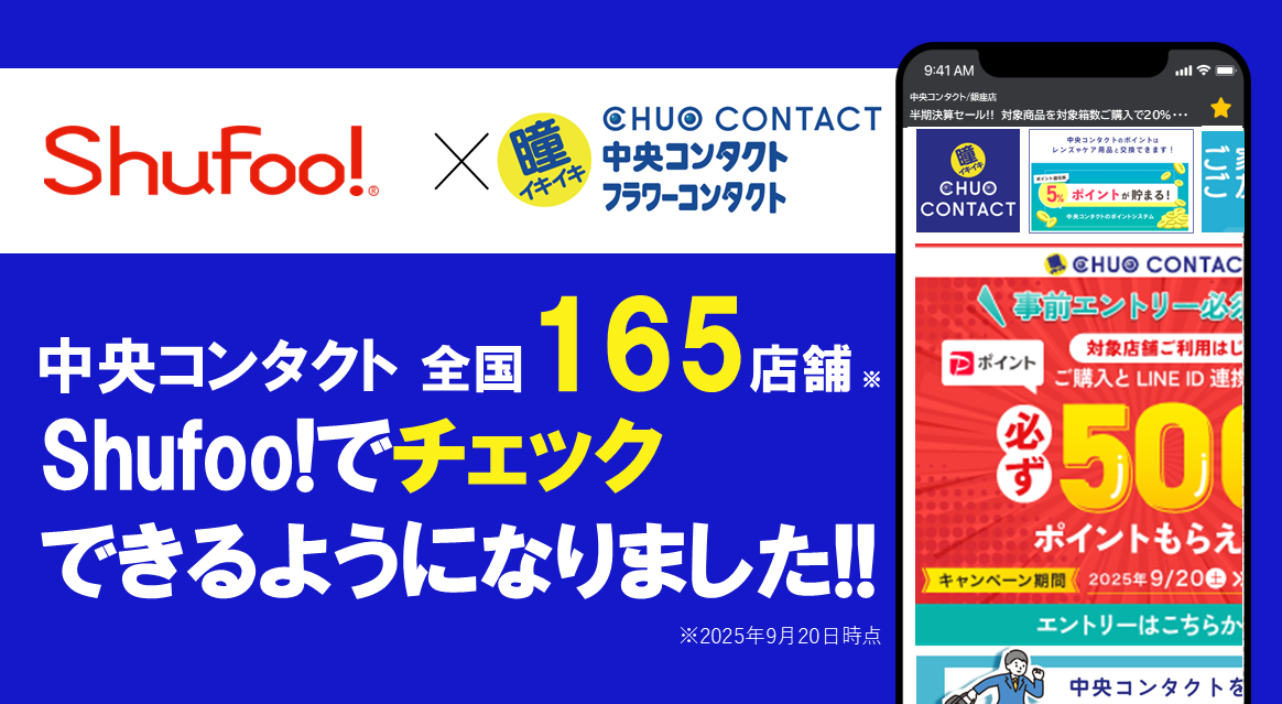 電子チラシサービスShufoo!、コンタクトレンズ専門店「中央コンタクト」「フラワーコンタクト」、カラコン専門店「Measis(メアシス)」の情報がチェックできるようになりました!