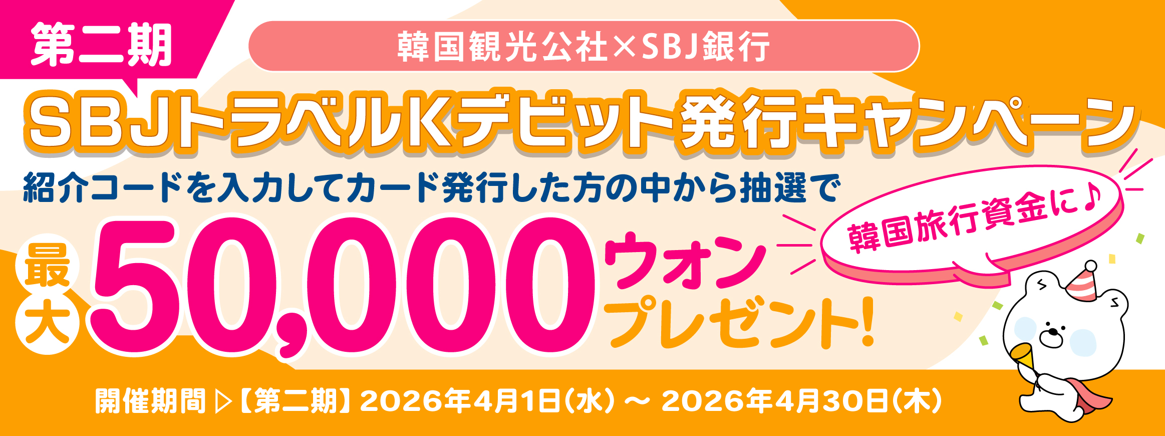 【韓国観光公社とのコラボキャンペーン!!最大50,000ウォンが当たるチャンス!!】「韓国観光公社×SBJ銀行 SBJトラベルKデビット発行キャンペーン」実施(条件達成者の中から抽選で当たる!)