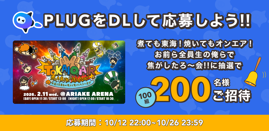 『PLUG』人気動画クリエーター 東海オンエアとコラボ 抽選で100組200名様をイベントにご招待!