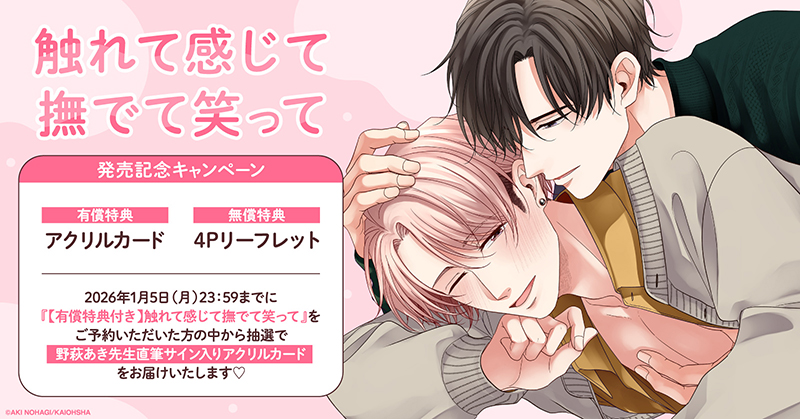 直筆サイン入りアクリルカードが当たる!野萩あき先生『触れて感じて撫でて笑って』発売記念キャンペーン開催!【ホーリンラブブックス】