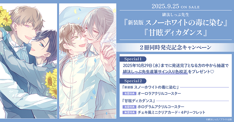 直筆サイン入り色校正が当たる!緋汰しっぷ先生『新装版 スノーホワイトの毒に染む』『甘眩ディカダンス』2冊同時発売記念キャンペーン開催!【ホーリンラブブックス】